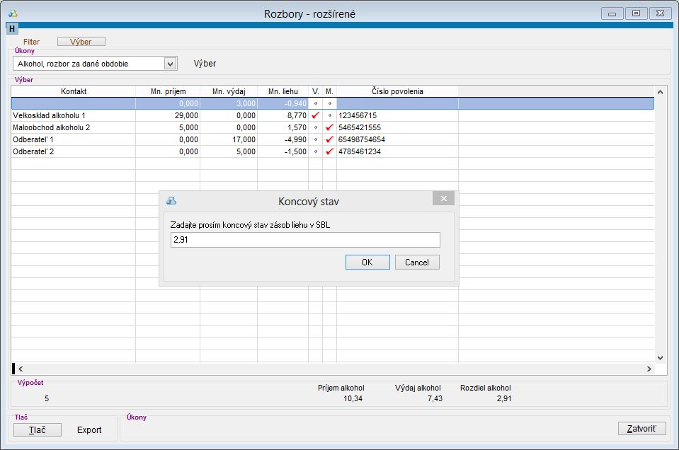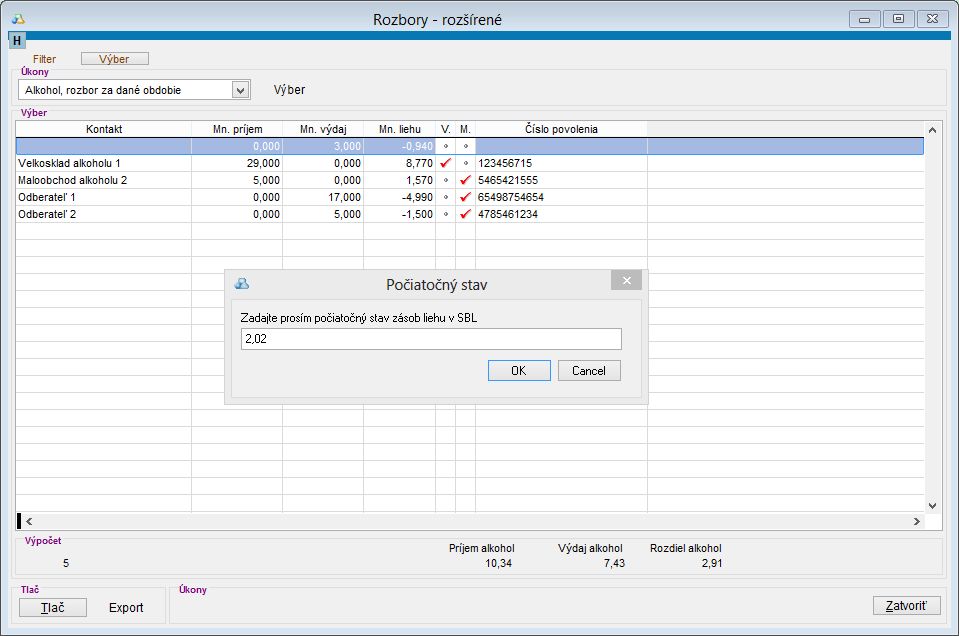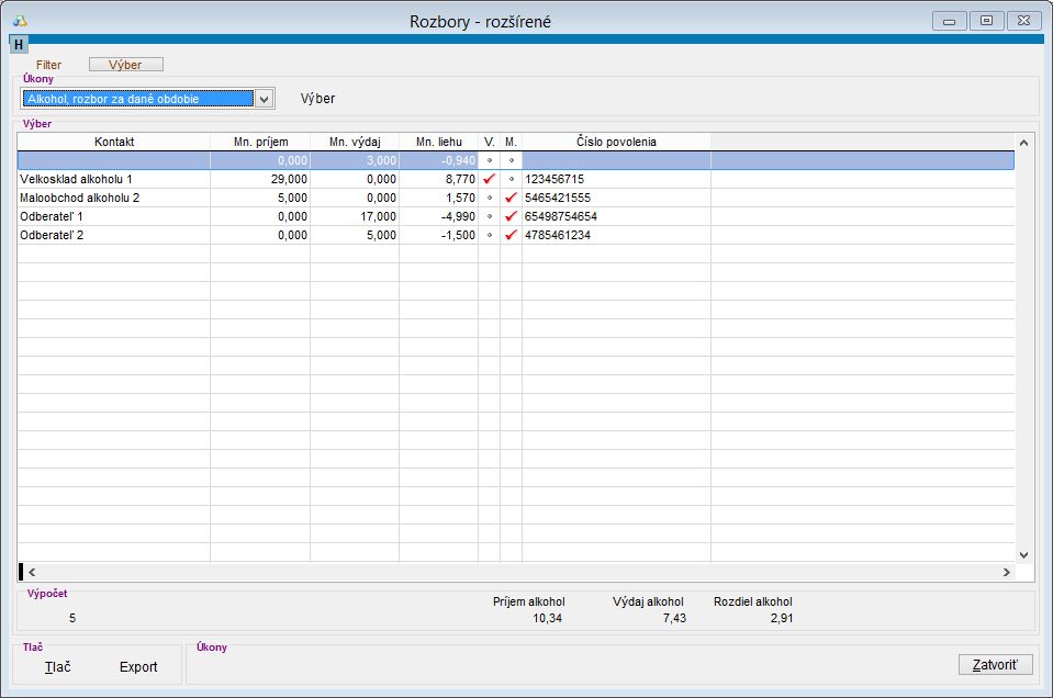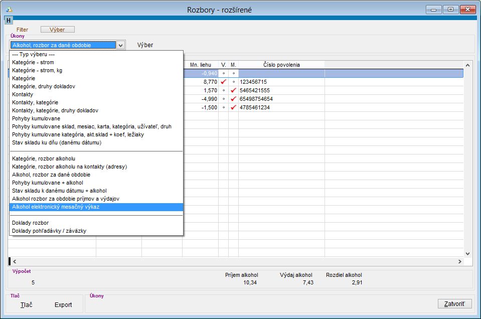 - V časti Úkony vyberte možnosť Alkohol, rozbor za dané obdobie. Aplikácia vykoná výber údajov podľa nastavených filtrov do zoznamu a v sekcii Výpočet sčíta príjmy a výdaje, kde ich vyčísli aj v čistom alkohole. Tieto hodnoty Vám odporúčame skonfrontovať s Podrobným výkazom alkoholu. Pozor, ak je stĺpec Číslo povolenia červeným, znamená to nevyplnené číslo povolenia odberateľa / dodávateľa. (Skontrolujte, či má daný kontakt v adresári správne vyplnené údaje pre Rozbor alkoholu.)