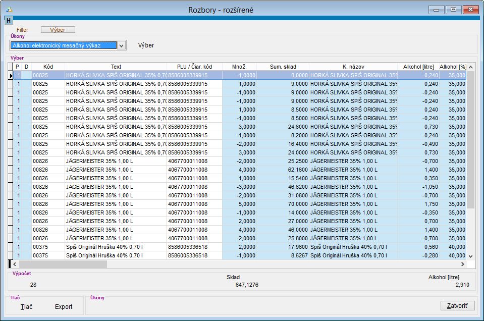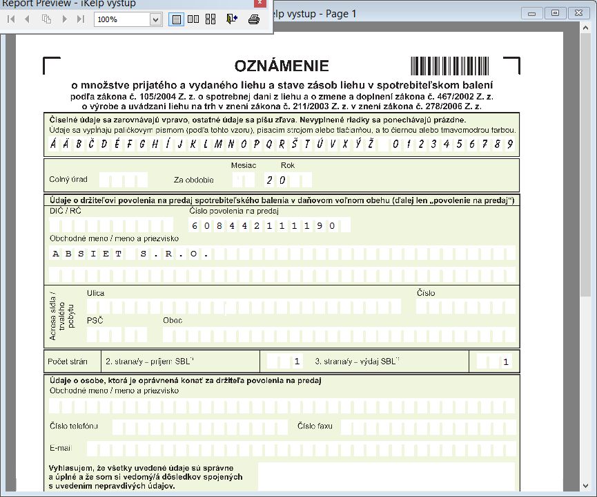 Mesačný výkaz alkoholu - Oznámenie o množstve prijatého a vydaného liehu a stave zásob liehu v spotrebiteľskom balení.