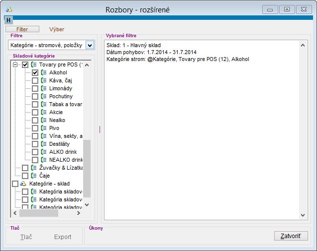 - Kategórie - stromové, položky: ak máte zaradené všetky skladové karty, ktoré majú vstupovať do výpočtu výkazu alkoholu do kategórie, tak môžete vybrať túto kategóriu ktorá sa pridá do popisu vyberaného filtra.