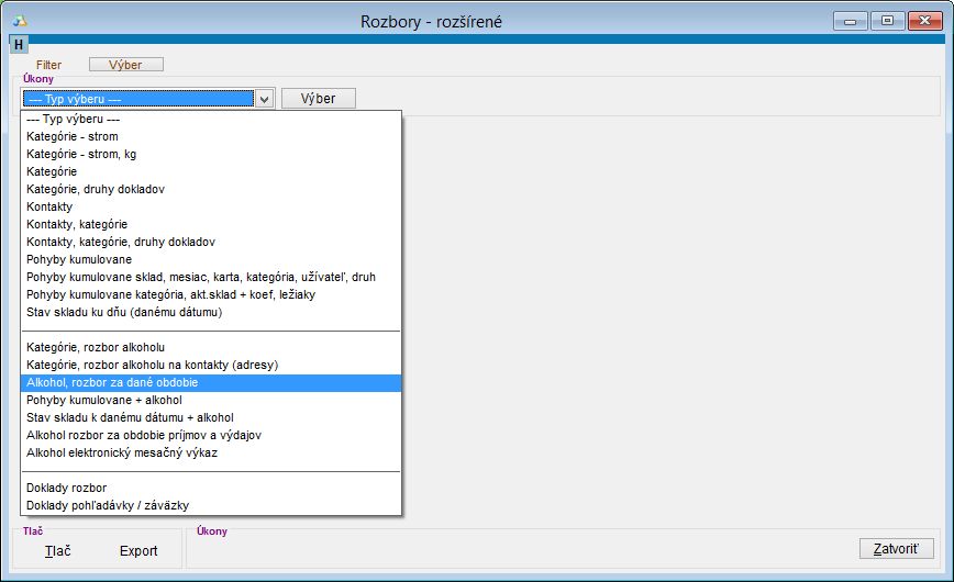 - V záložke Filter je potrebné vybrať obdobie a údaje, ktoré budú započítané do výkazu alkoholu: