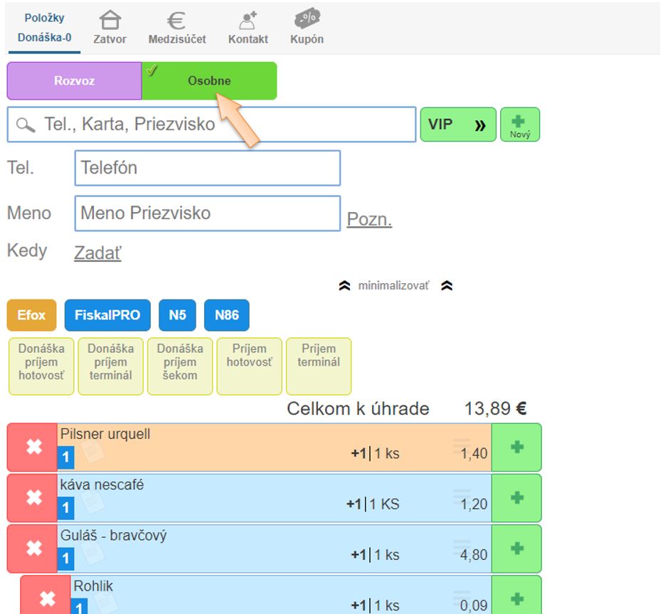 - Kliknite na ikonu platidla pre doplatenie zvyšnej sumy, napr. Príjem hotovosť.
