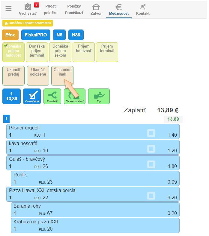 - Pomocou Čiastočne inak je možné doklad zaplatiť rôznymi platidlami. (Napr. časť stravnými lístkami, časť hotovosťou.)