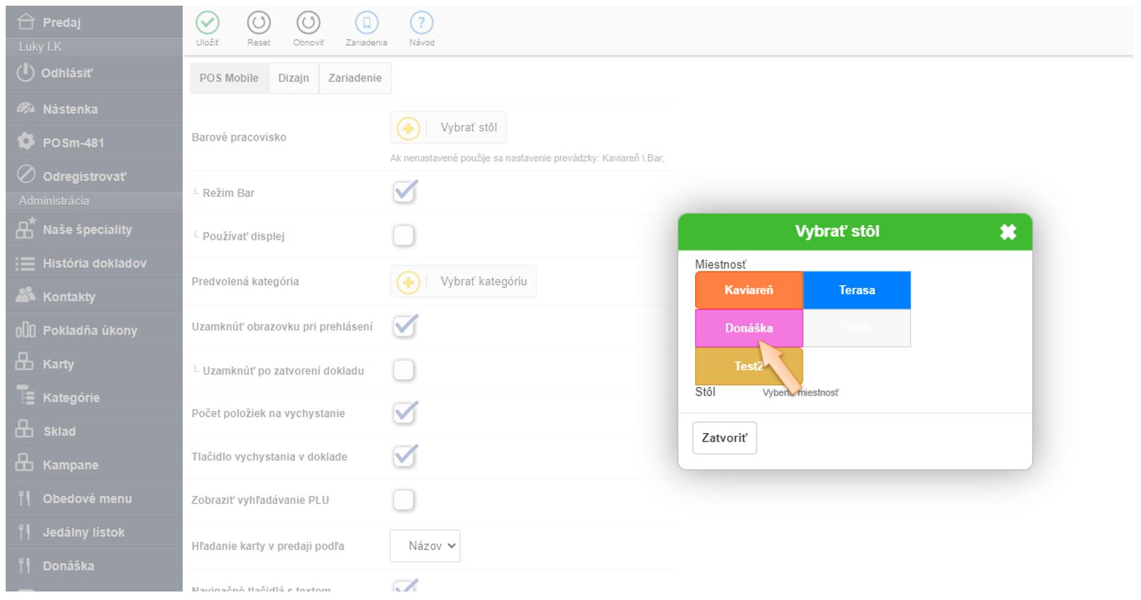 - V časti Barové pracovisko kliknutím na + Vybrať stôl vyberte miestnosť Donáška.