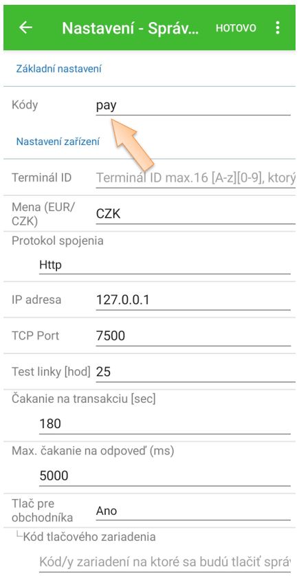- Zadajte v častii Kódy názov (kód) zariadenia. (Kód zariadenia musí byť zhodný s kódom zariadenia z POS Mobile. Odporúčame ponechať kód pay, ak už tento nie je použitý na inom zariadení.)