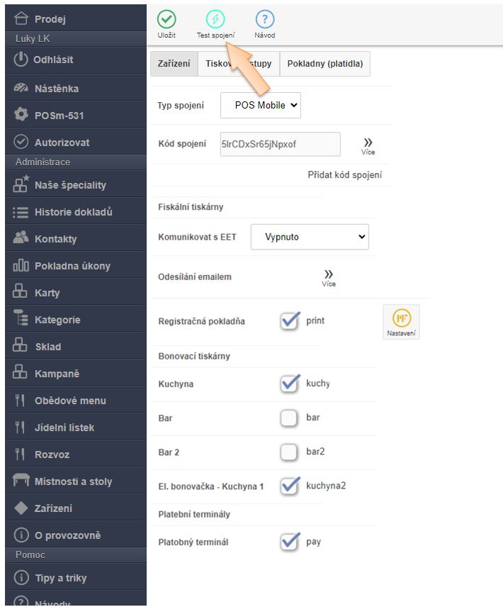 Ak je zariadenie v aplikácii POS Mobile aktívne, viete si komunikáciu s terminálom overiť pomocou testu spojenia.