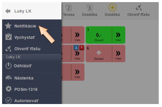 Okrem zobrazenia správy o notifikácii v miestnosti a na danom stole, je k dispozícii aj zoznam všetkých notifikácií v Menu aplikácie, kliknutím na Notifikácie.