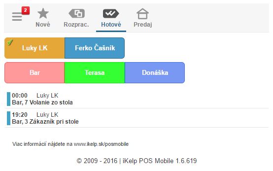 - Zoznam aktívnych notifikácií je možné filtrovať na jednotlivé miestnosti, kliknutím na ikonu je možné zmeniť ich stav na Rozpracované alebo Hotové. V príslušnej záložke je potom možné zobraziť rozpracované, alebo hotové notifikácie. Akonáhle je doklad ukončený, notifikácie sú zo systému odstránené.