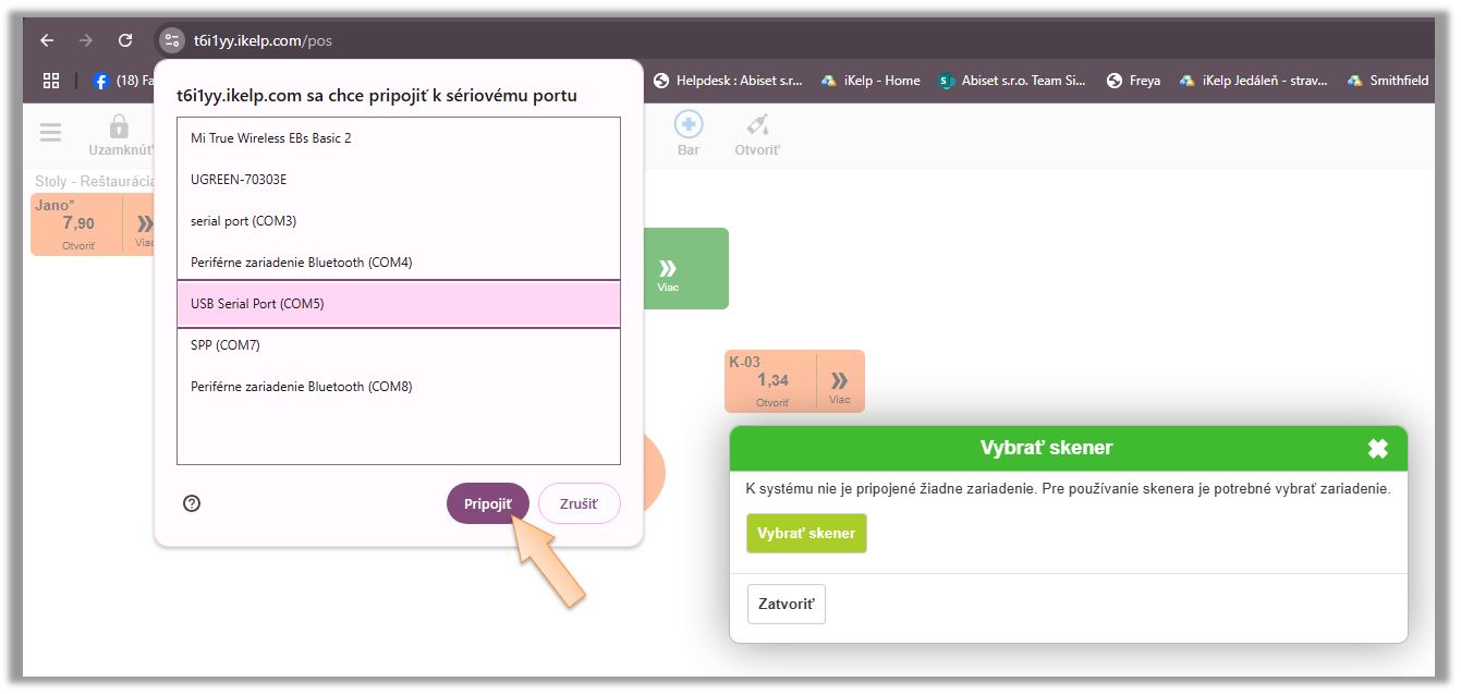 - Kliknite na zariadenie v zozname. (Ak neviete, ktoré z ponúkaných zariadení je RFID čítačka, odpojte ju zo systému a zariadenie sa stratí zo zoznamu. Opätovným pripojením zistíte, ktoré zariadenie zo zoznamu čítačka je.)