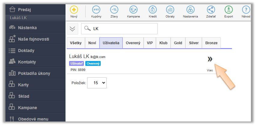 - Vyhľadajte v záložke Užívatelia užívateľa (čašníka) a kliknite na Viac.
