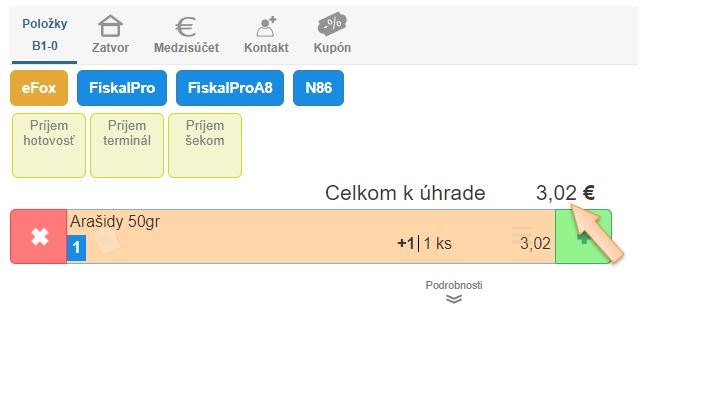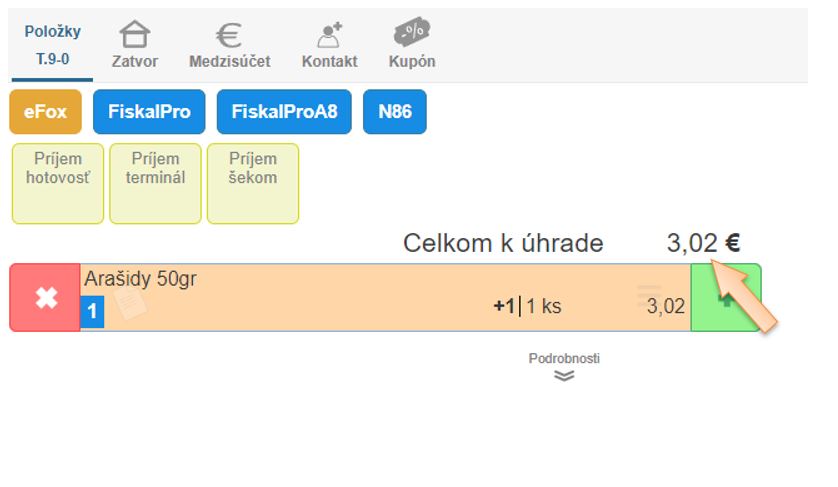 Opäť na vzorovom príklade rovnaká položka v sume 3,02€, pričom pri ukončovaní dokladu a výbere platidla Terminál už celková cena nie je zaokrúhlená. Tak isto ako v prvom príklade sa prijatá suma započíta do Nástenky aj záznamov pokladne v takej výške, ako bola prijatá od zákazníka.