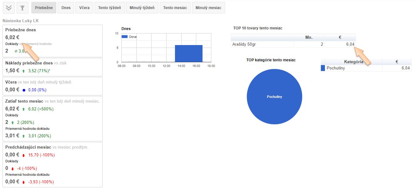 Na vzorovom príklade je jedna položka v sume 3,02€ ukončená platbou v Hotovosti, kde je vidieť, ako je suma zaokrúhlená ako aj to, ako sa následne toto zaokrúhľenie prejaví na Nástenke a v záznamoch pokladne. V záznamoch pokladne aj v tržbe je započítaná suma, ktorú obsluha prijala od zákazníka samozrejme zaokrúhlená, pričom v štatistikách predajov položiek je evidovaná predajná cena nezaokrúhlená.