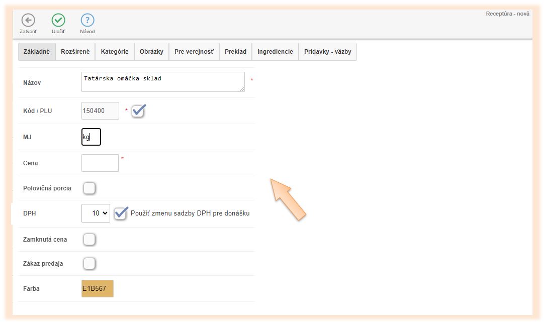 - Názov vyplňte "Domáca tatárska omáčka" ako mernú jednotku nastavte "kg". (Táto ingrediencia bude slúžiť pre ostatné receptúry, napr. Vyprážaný syr s hranolkami a tatárskou omáčkou a pod.)