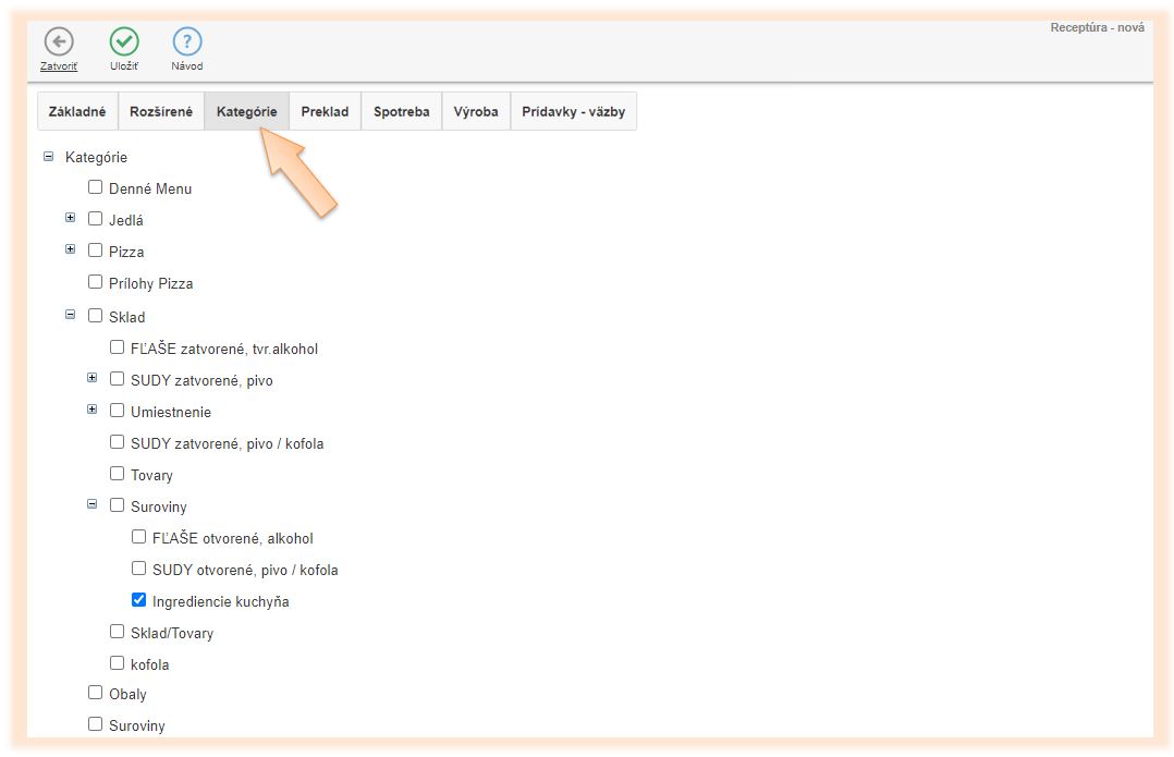 - V záložke Kategórie vyberte kategóriu Sklad.