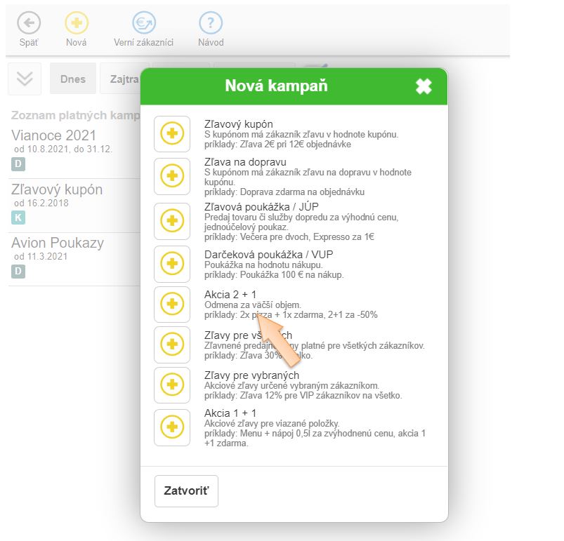 - Klknite na tlačidlo + Nová a vyberte možnosť Kampaň - Akcia 2 + 1.